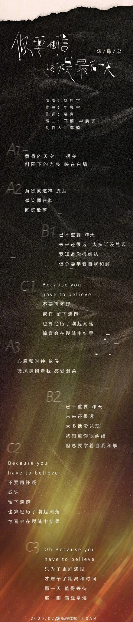 近日,华晨宇公益歌曲《你要相信这不是最后一天》歌词公布,不少音乐评论人光看歌词就给出创作聚焦患者内心,歌词真挚细腻,极具力量!这样的评论。