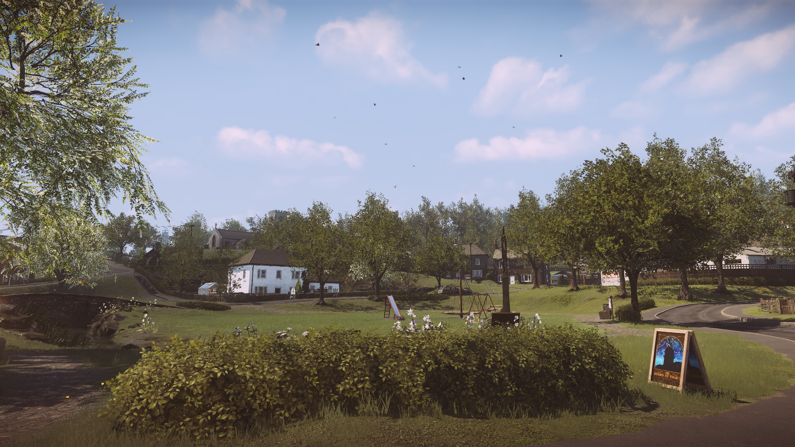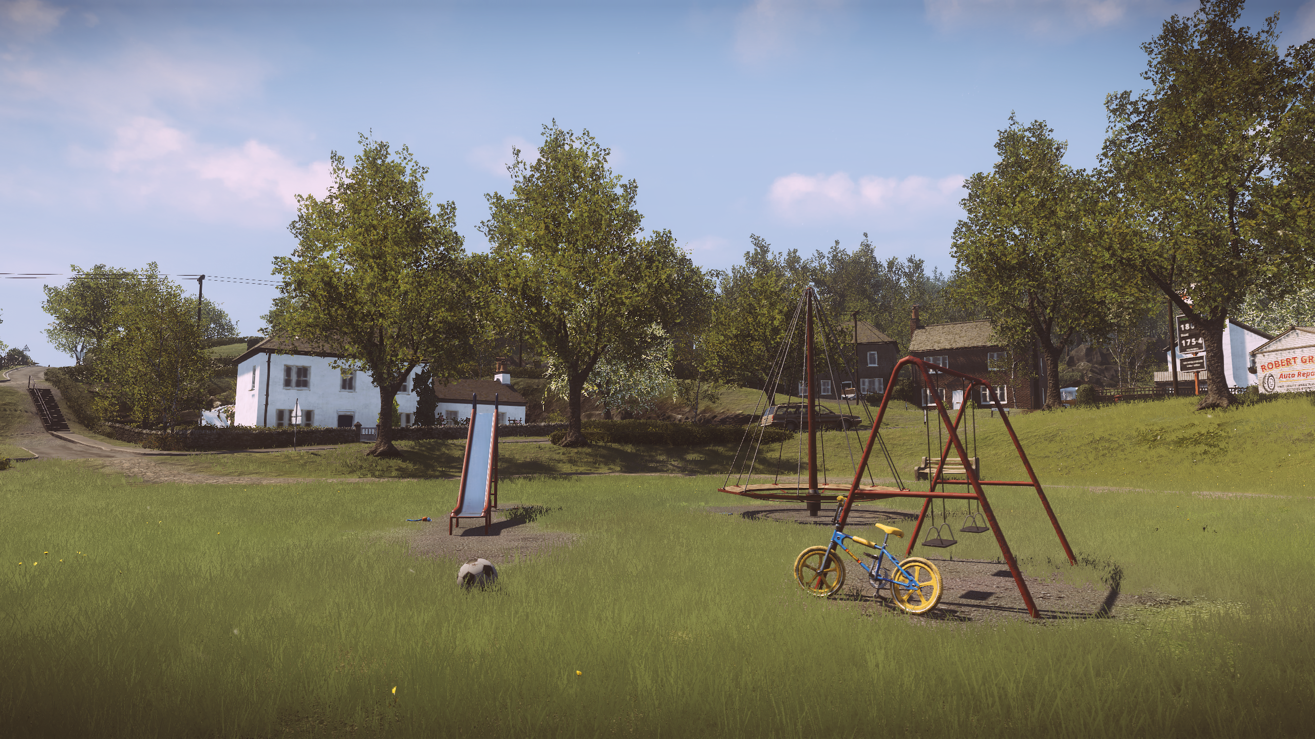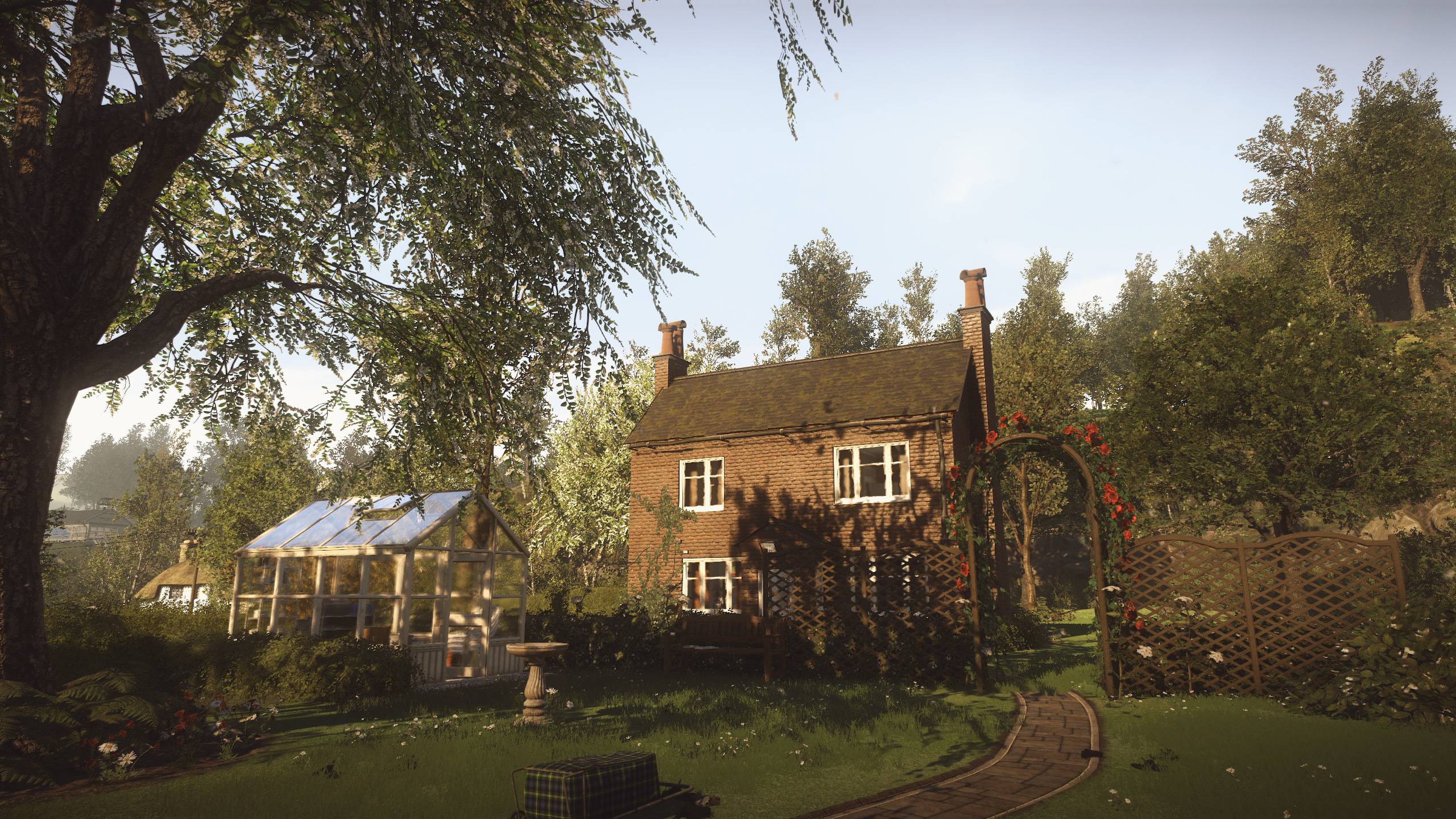 -不用怀疑这帮子艺术家在营造一个美丽世界的能力,”极乐世界“可以肯定的说就是目前的最佳画面奖得主了,它不仅是玩家目前能体验到的最好的画面,在未来五年,它仍然是最顶尖的那一批,一个普通的英国小镇在The Chinese Room手里就像人间天堂一样,在玩家踏上这片土地的那一刻,映入眼帘的除了美就是美,目光所及之处,每一片花草都让人陶醉,每一桩建筑都让人折服,游戏里特有的滤镜使玩家看到的所有事物都有一种独特的细腻感,这种细腻会使人产生比真实世界还要真实的错觉,你所到达的每一个地方都经过了精心的布置和修饰,在游戏的全篇,找不到一处让人感觉粗糙的角落,漫步在这个小镇其中,眼前的一切都与真实无异,它的面面俱到像是你可以亲手去触摸建筑上的每一根木材,每一块砖,走进它就像走进了一个超大型的小镇沙盘,住宅,公园,教堂 ,餐馆,所有的设施一应俱全,在这个方面”极乐世界“取得了相当高的成就,如果有游戏博物馆,这个小镇是应当放到博物馆里被后人瞻仰的。