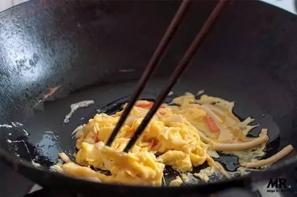- Step4 -平底锅放入色拉油预热,将打好的蟹肉和蛋液放进锅里,搅拌的同时煎至半熟,不要炒老。